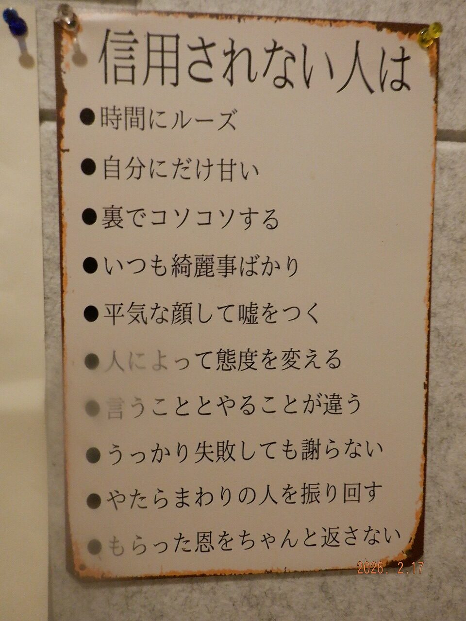 相模原と座間 投稿日 2026年2月17日 更新日 2026年2月18日 著者 アイズ カテゴリー 営業飯 新潟から群馬経由都内そして 神奈川 多忙な高市さんのスケジュールの 100分の1くらい思うけど 同世代で自力移動としては まあまあ 頑張ってる ほうかもね 当地の社長と 吉田類さんが来た事ある お店で 薩摩白波湯割りで 乾杯 本日 心に残った 看板 2つ 乗合バスの 運転手さん後ろの 1等で席は まもなく 着座禁止に なってしまう この記事を書いた人 アイズ 記事一覧