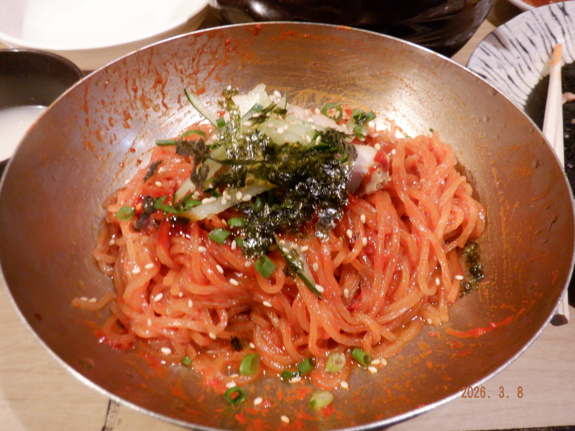 ご出勤前の 夜のご婦人に挟まれ 最高のポジションで ビビン麺と生マッコリを頂いた