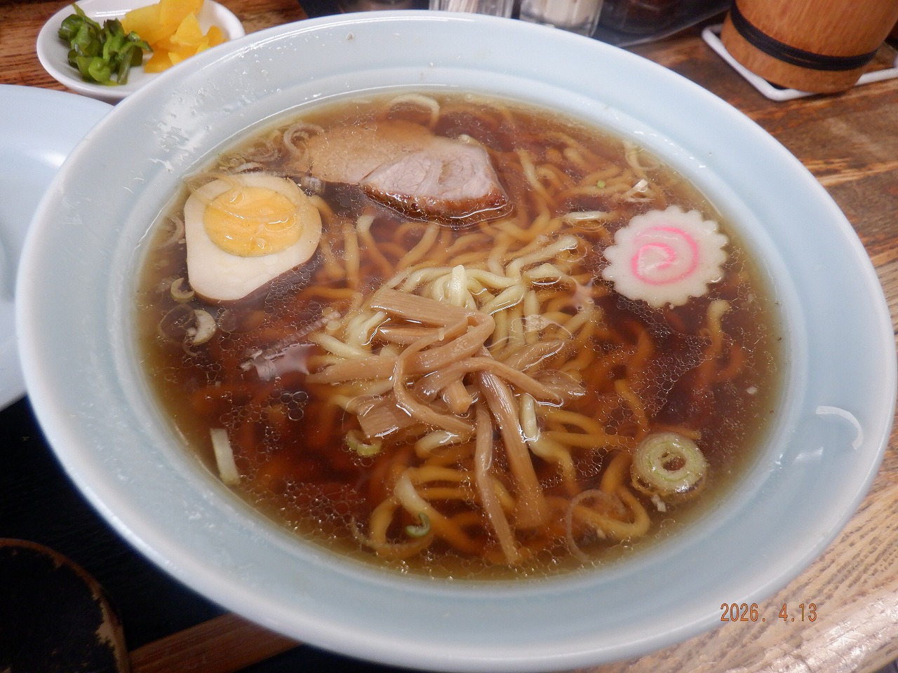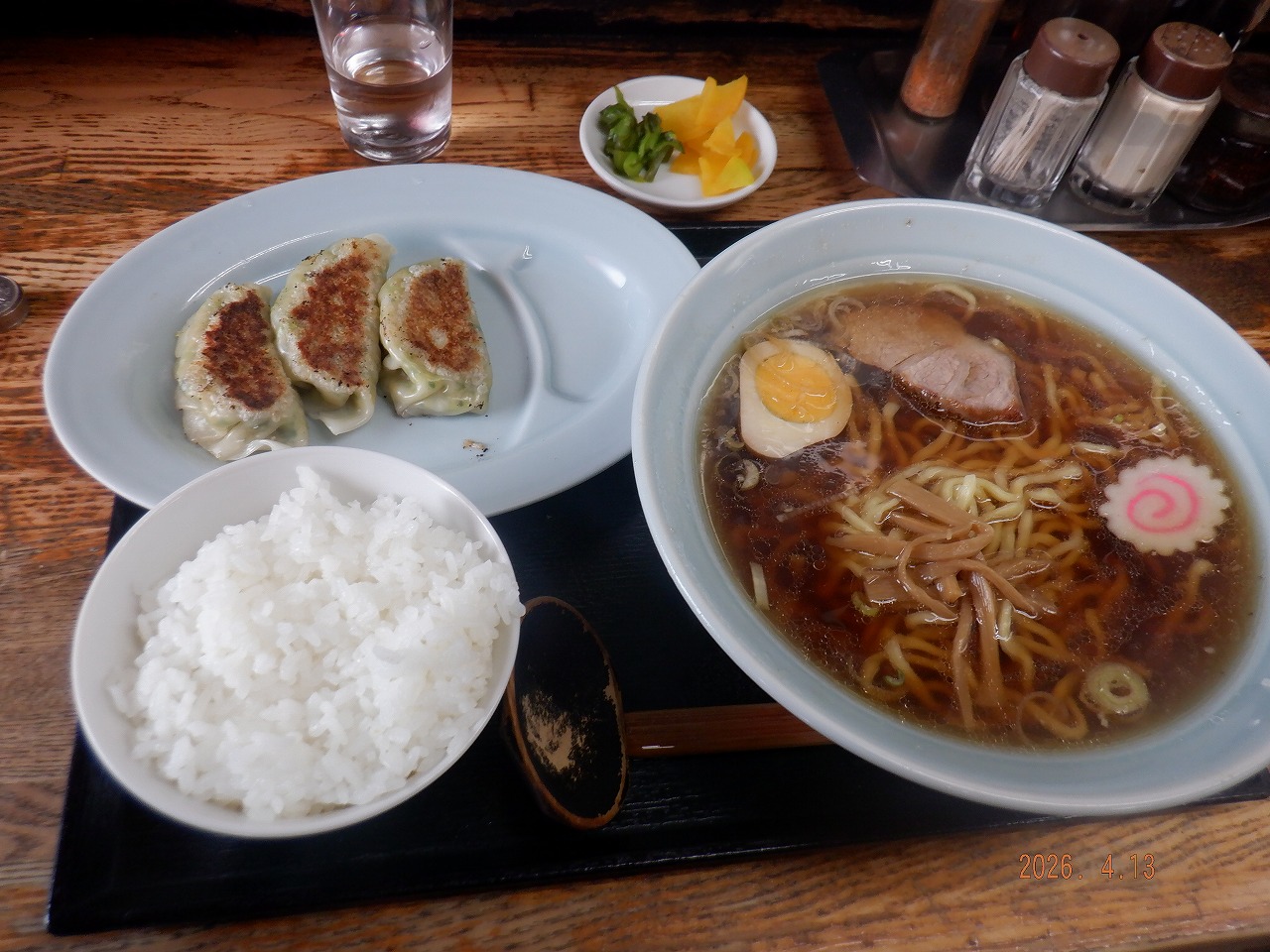 割と大振りな餃子3個+小ライス+普通サイズの醤油ラーメン+漬物=790円(税込)